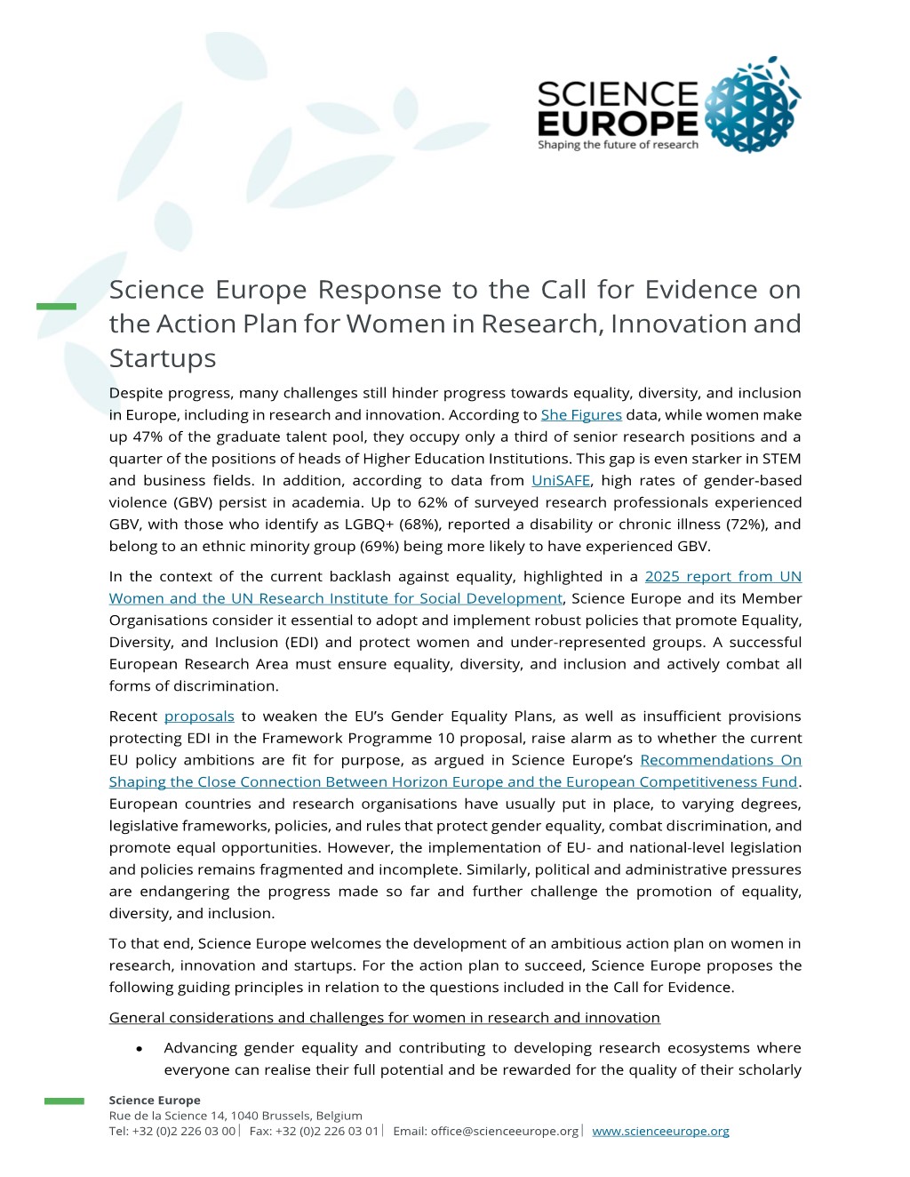 Science Europe has responded to the European Commission’s Call for Evidence on the Action Plan for Women in Research, Innovation and Start-ups, setting out concrete proposals to strengthen equality, diversity, and inclusion across Europe’s research and innovation systems.