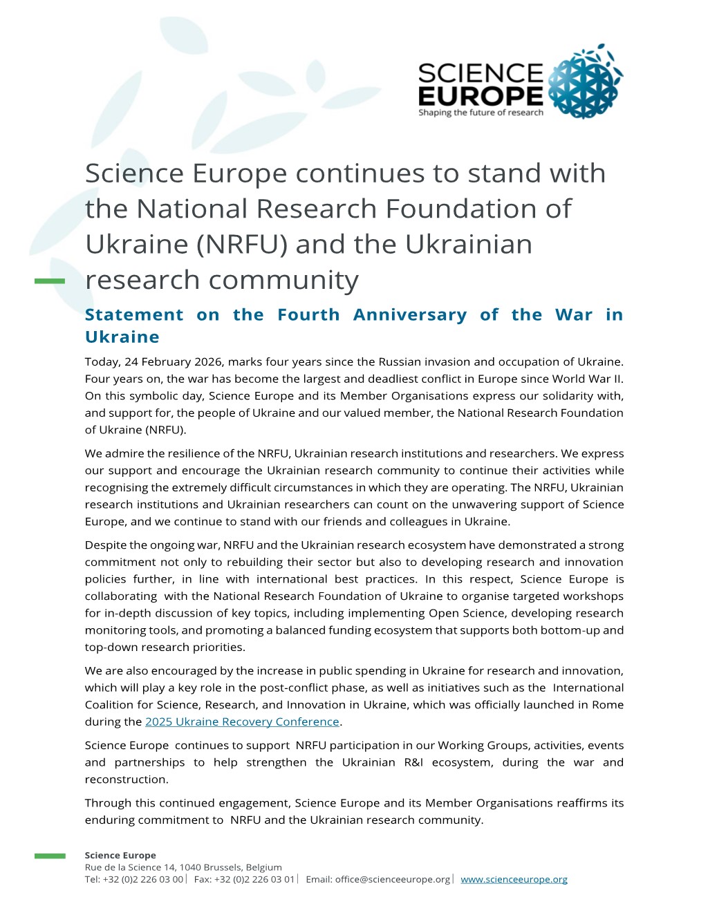 As part of its efforts to support the Ukrainian research ecosystem during the ongoing war, Science Europe and NRFU are jointly organising three online workshops between September 2025 and February 2026 to address the current priority areas for Ukrainian research.