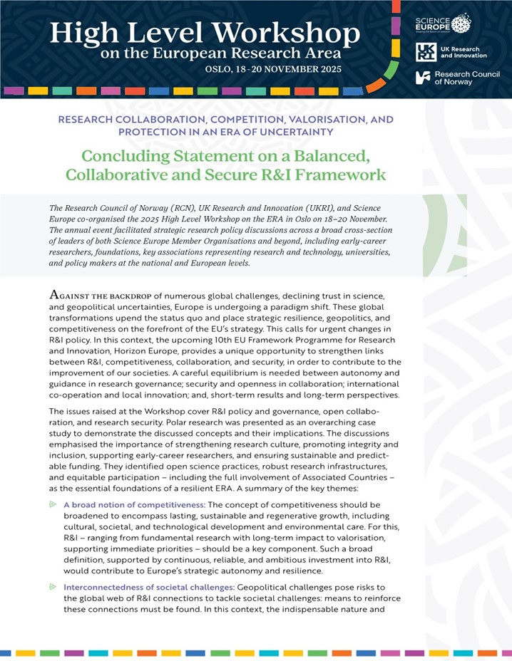 The Research Council of Norway (RCN), UK Research and innovation (UKRI) and Science Europe organised the 2025 High Level Workshop on the European Research Area on 18-20 November in Oslo, Norway.