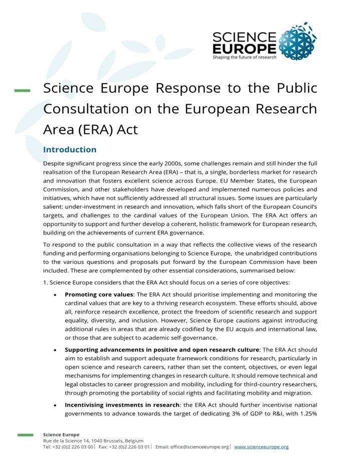 Science Europe has responded to the European Commission’s public consultation on the proposed European Research Area (ERA) Act, setting out the collective views of its Member Organisations on how the legislation can effectively strengthen framework conditions for research and innovation, while safeguarding academic freedom, institutional autonomy, and the diversity of national research systems.