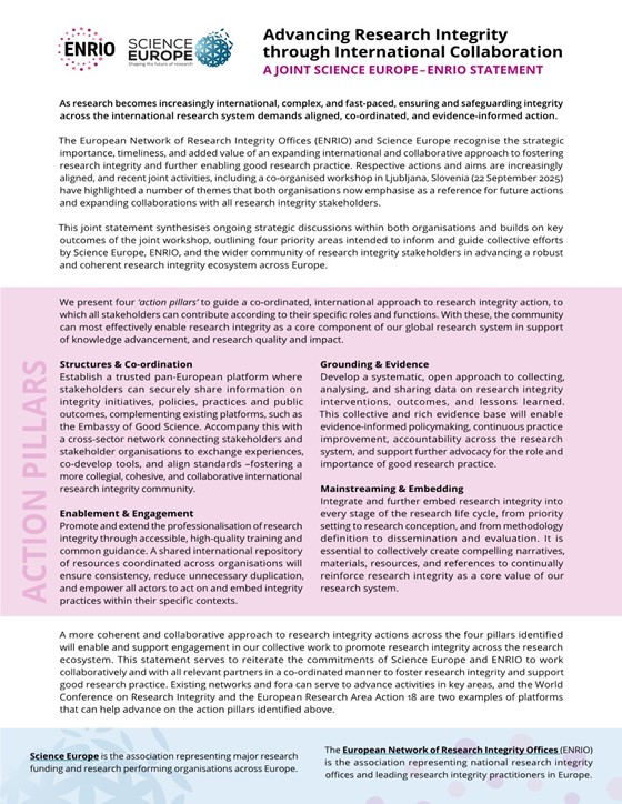 This joint initiative underscores the added value of international collaboration and engagement across all research integrity stakeholders. With many existing networks already acting in key areas, and in light of the soon-to-be-launched European Research Area Action 18 on integrity and ethics, Science Europe and ENRIO reaffirm their commitment to co-ordinated and collaborative efforts that foster research integrity and support good research practice across Europe.