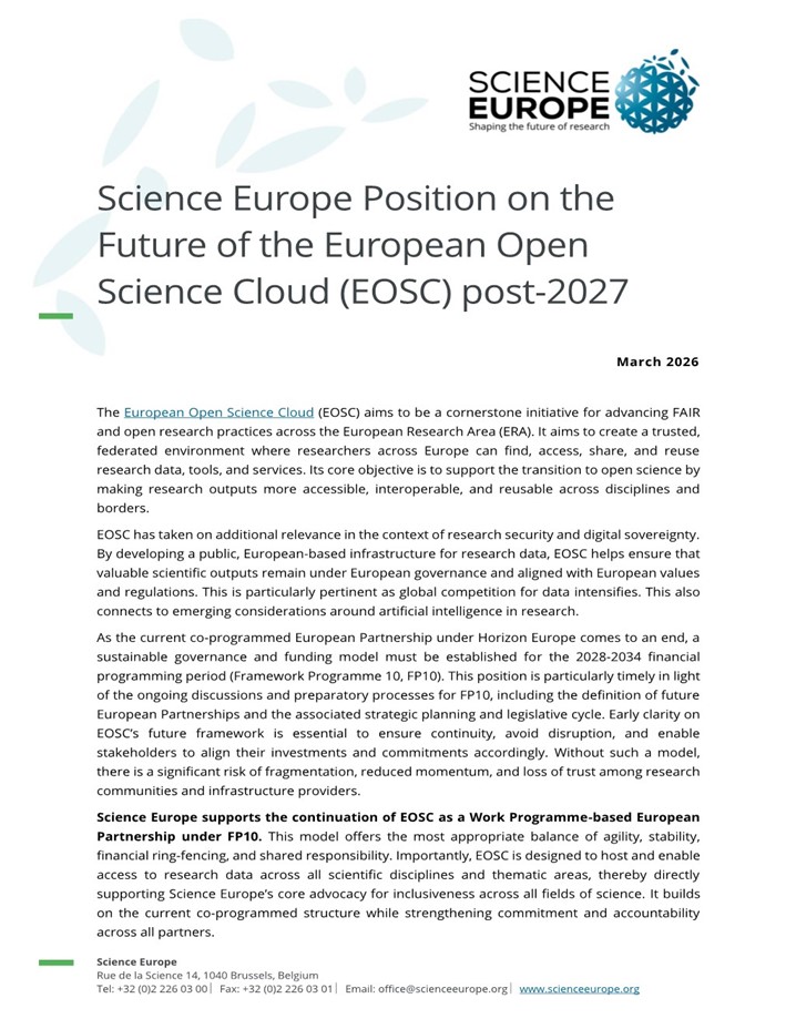 Science Europe has published a new position on the future of the European Open Science Cloud (EOSC), calling for a stable and sustainable framework under the next EU research and innovation programme (FP10).