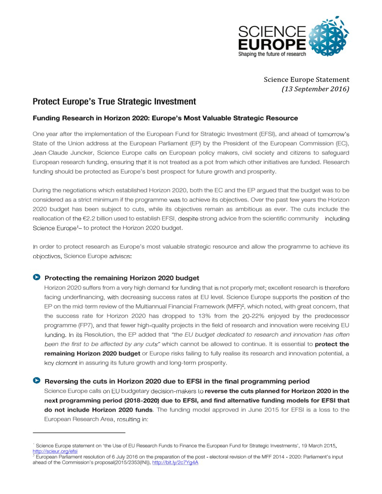 Science Europe expresses strong concern that the research funding budget be maximised in Horizon 2020 so that Europe can fully realise its target of becoming a smart, sustainable and inclusive economy. Funding for research and innovation in Europe is a critical strategic investment which is essential for Europe’s long-term growth and prosperity.