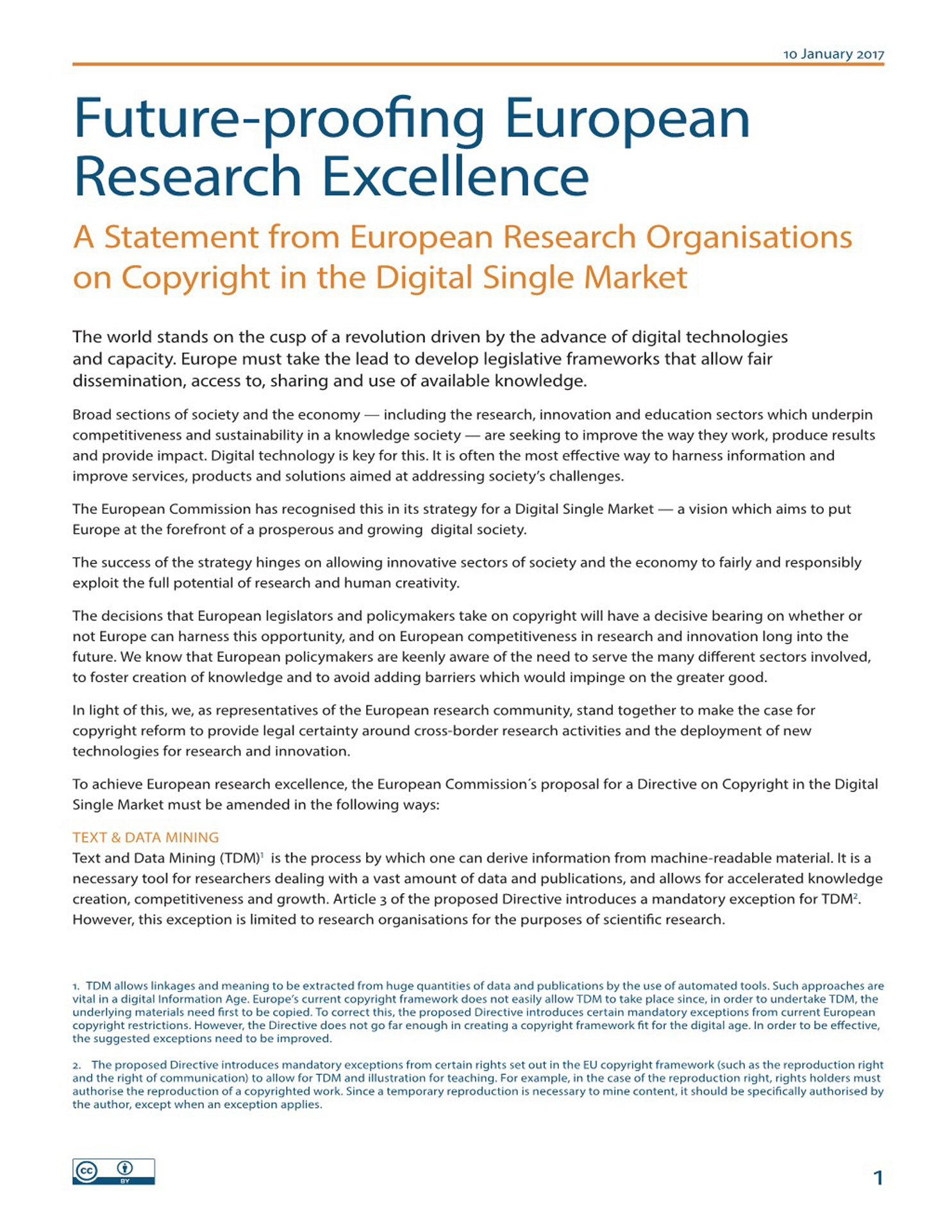 LIBER Europe, CESAER, EUA, LERU, and Science Europe — who together represent hundreds of universities, libraries, and research funding and performing organisations — call on Members of the European Parliament to modify the current EU copyright reform proposal. Amendments in five main areas of the proposal are critical if Europe wants to be at the forefront of a prosperous and growing digital society. Europe must take the lead to develop legislative frameworks that allow fair dissemination, access to, sharing and use of available knowledge.