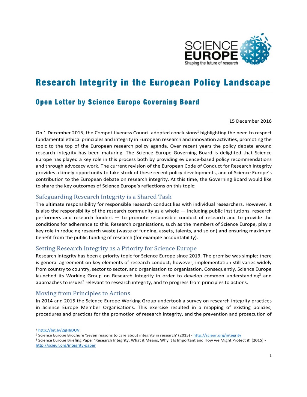 Open Letter from the Governing Board of Science Europe on Research Integrity in the European Policy Landscape