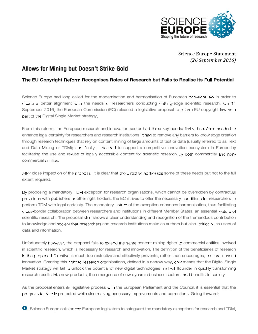 Allows for Mining but Doesn't Strike Gold: Science Europe Copyright Statement