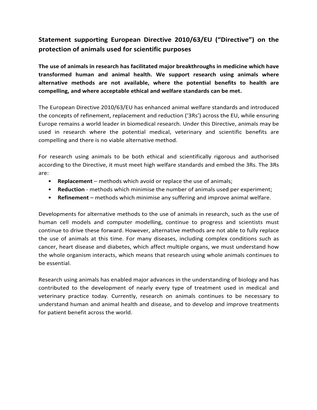 Protecting the use of animals for scientific purposes is of utmost importance. Over 240 leading biomedical research organisations, learned societies, industry representatives, universities and patient groups in Europe release this joint statement in support of the Directive 2010/63/EU which outlines the protection of the use of animals for scientific purposes.