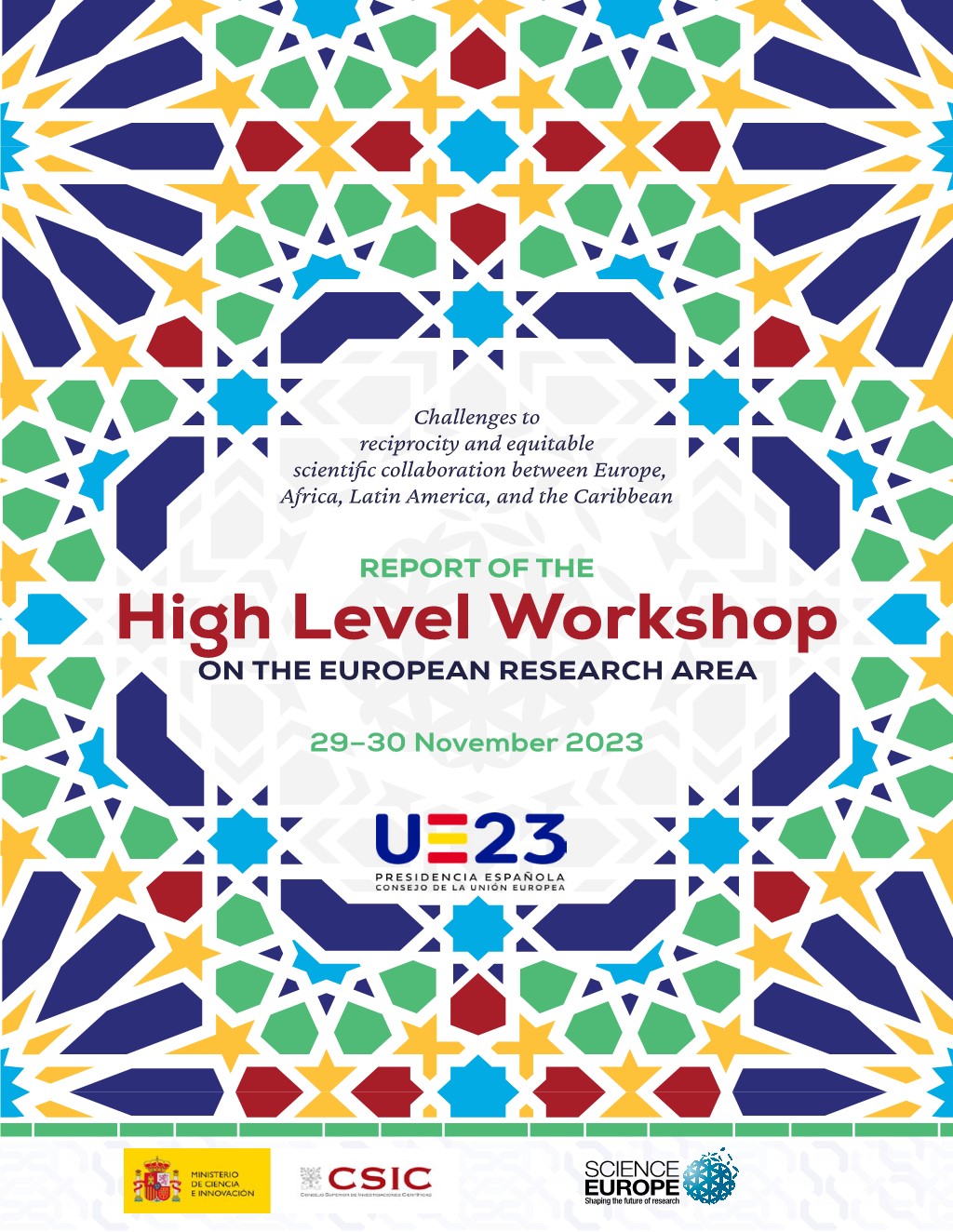 This report presents the discussions and outcomes of the main and satellite events held as part of the 2023 High Level Workshop on the ERA. This edition of the event dealt with international scientific collaboration between Europe, Africa, Latin America, and the Caribbean, based on principles of reciprocity and equity.