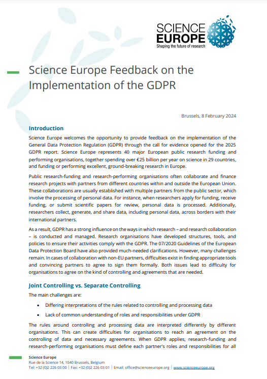 Science Europe has provided feedback to the European Commission on the implementation of the General Data Protection Regulation (GDPR) through the call for evidence opened for the 2025 GDPR report.