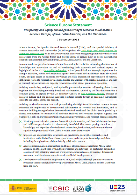This statement presents some of the high-level outcomes from the 2023 High Level Workshop on 'Challenges to Reciprocity and Equitable Collaboration between Europe, Africa, Latin America, and the Caribbean'.