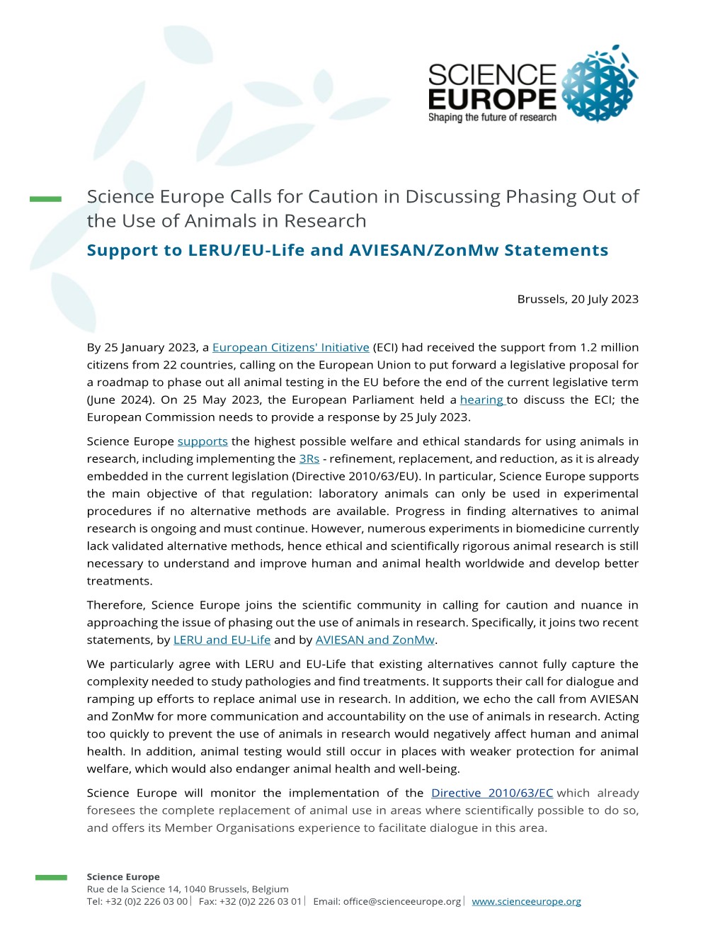 Science Europe supports the scientific community in calling for caution and nuance in approaching the issue of phasing out the use of animals in research, and endorses statements by several stakeholders.